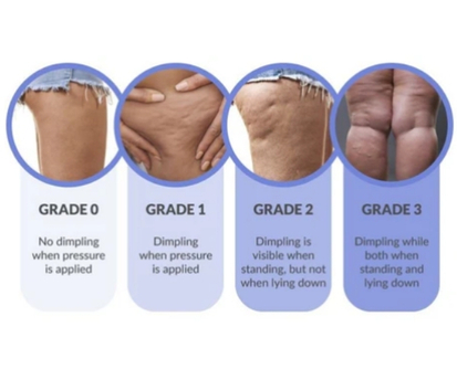 Cellulite is a term used to describe the dimpled appearance of skin caused by fat deposits that are just below the surface of the skin. It generally appears on skin at the hips, thighs, and pelvic region. More commonly found in women than men due to genetic and hormonal reasons. Lack of exercise and poor diet (fatty food and little drinking) may increase the risk of getting cellulite. Smoking makes it worse.
