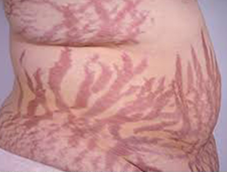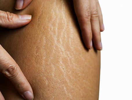 Stretch Marks also known as striae, are a form of scarring on the body. Stretch marks typically appear as bands of parallel lines on your skin. These lines are of different color range from purple to bright pink to light gray. When you touch stretch marks with your fingers, you might feel a slight ridge or indentation on your skin. Stretch marks occur when the dermis, the middle layer of your skin, is stretched to a point where its elasticity begins to break down. Stretch marks may also appear on the body in many different places due to reasons such as pregnancy, sudden weight gain or loss etc .
