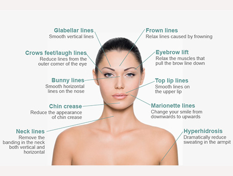 Botox relaxes muscle of expressions are effective in reducing the wrinkles formed due to our expressions such as, frown lines, crows feet(smile lines around eyes), lines on the forehead, bunny lines on the nose.